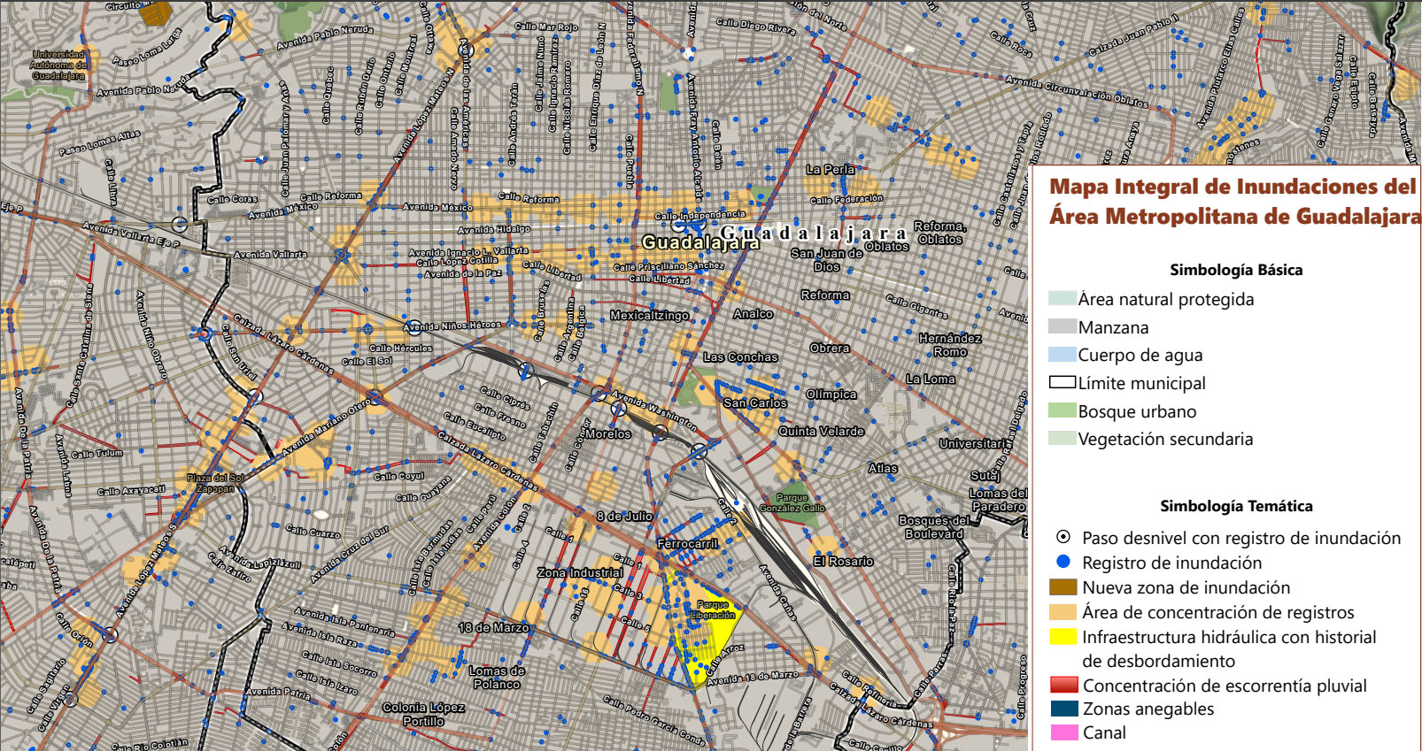 Estas zonas de riesgo fueron documentadas por investigadores de la Universidad de Guadalajara y de la empresa GeoRiesgos en el Mapa de integral de inundaciones, el cual compila información como los pasos desnivel con registro de inundación, infraestructura hidráulica con historial de desbordamiento, zonas anegables, entre otros datos.