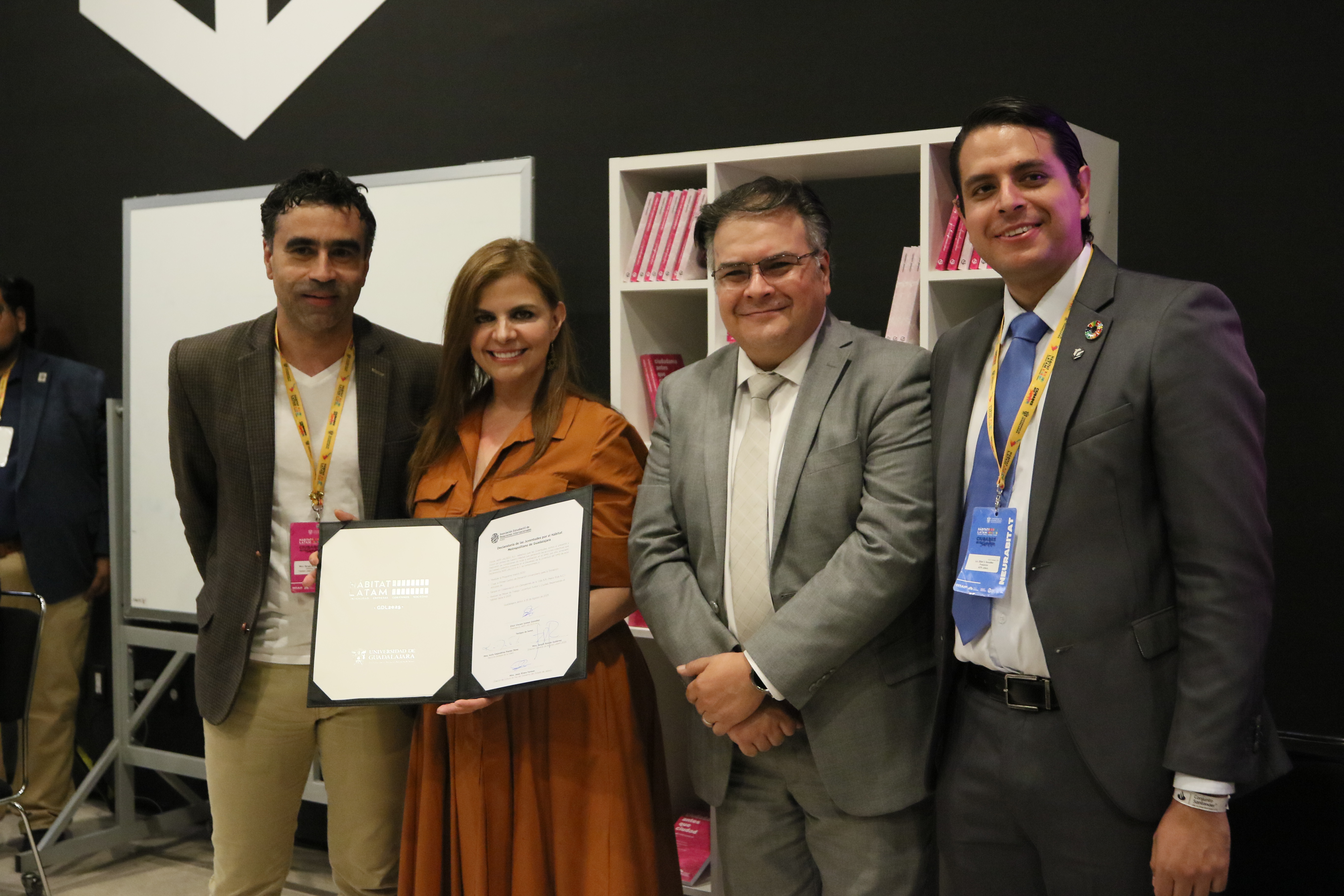 Los miembros de la Asociación Estudiantil de Relaciones Internacionales de Jalisco (AERI) firmaron la Declaratoria de las Juventudes por el Hábitat Metropolitano 2025, en el marco del Hábitat LATAM, para crear espacios y actividades en barrios marginados, fomentar la participación ciudadana, además de buscar la regularización de casas abandonadas y una política urbana orientada al peatón.