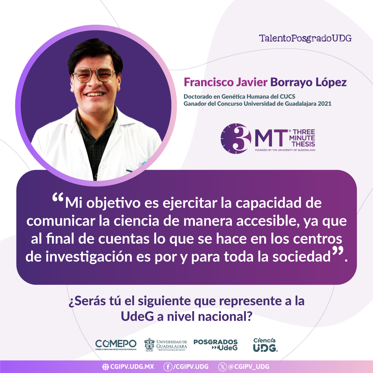 La Universidad de Guadalajara a través de la Coordinación General de Investigación, Posgrado y Vinculación (CGIPV), invita por 4to. año consecutivo a todas y todos sus alumnos de doctorado a participar en el concurso institucional Universidad de Guadalajara 3MT 2024, que se llevará a cabo el 9 de agosto de 2024.
