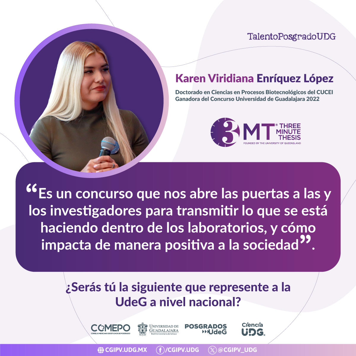 El o la ganadora del concurso institucional participará en el Concurso Nacional 3MT representando a la Universidad de Guadalajara a celebrarse el 27 de septiembre del 2024, y de ganar tendría la posibilidad de participar en el concurso internacional.