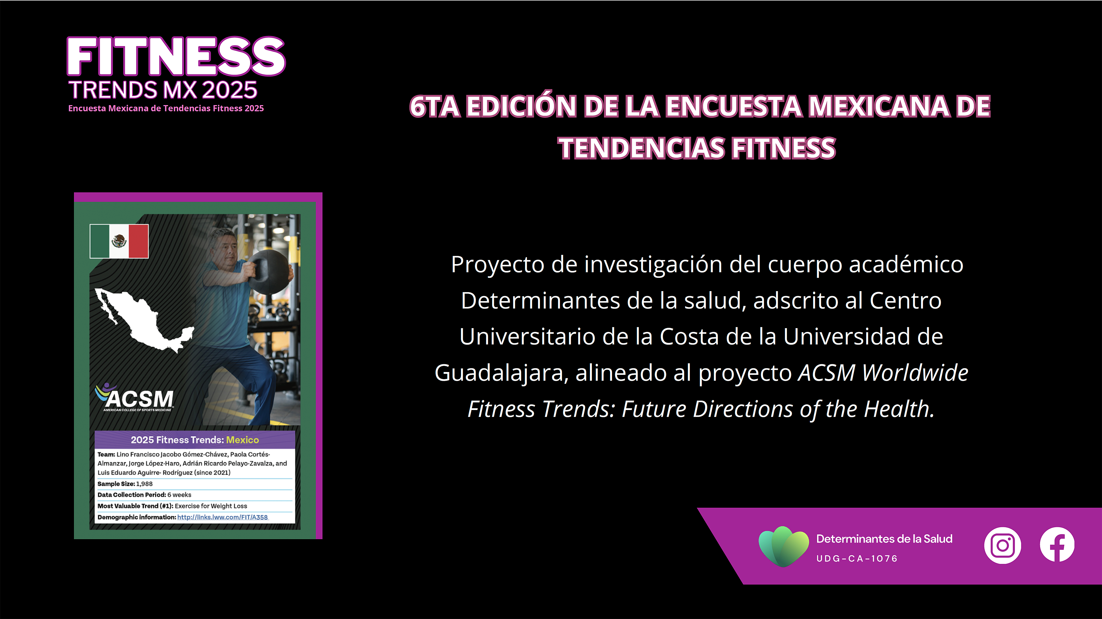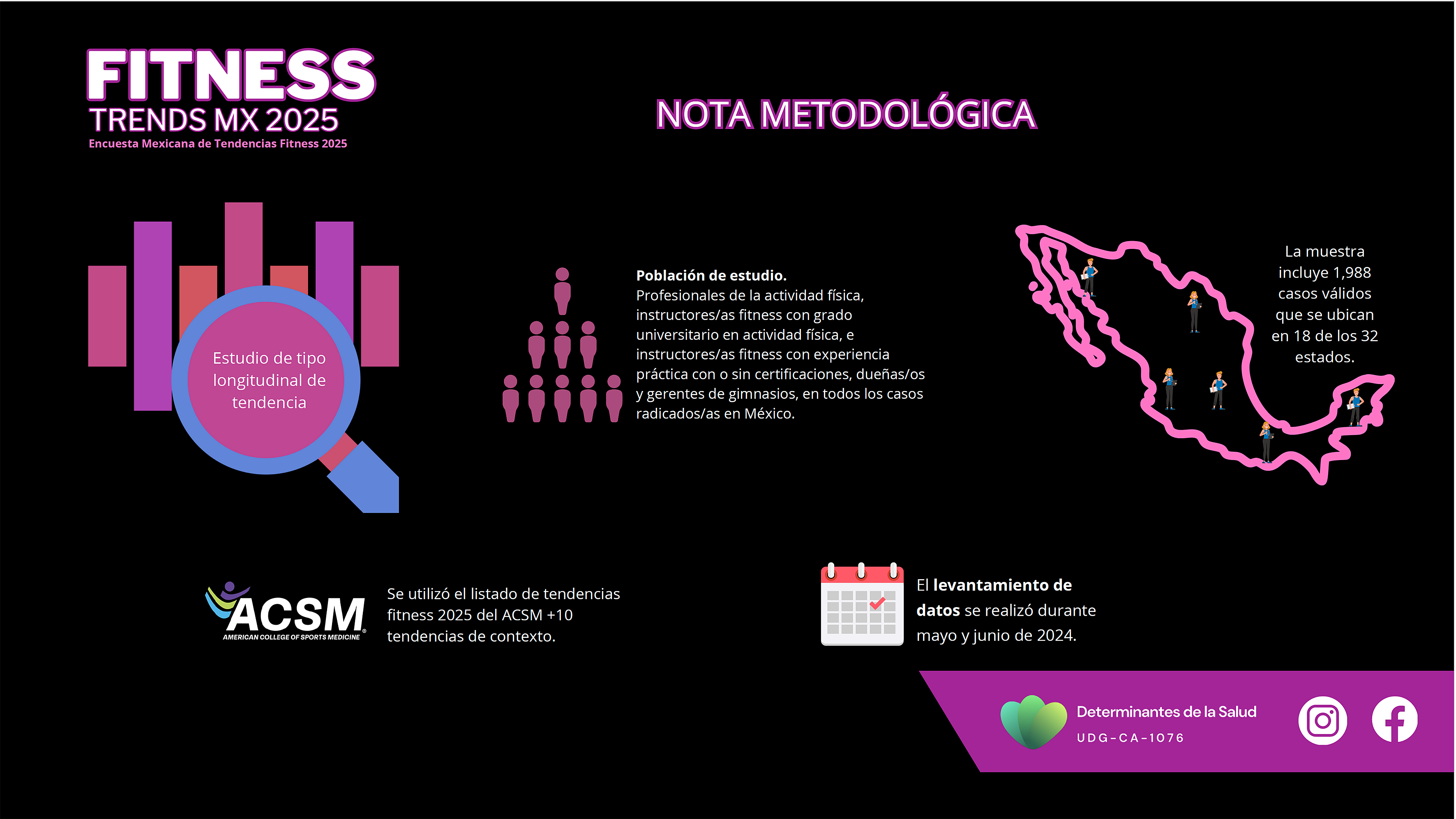 El Coordinador de la encuesta y profesor del CUCosta, doctor Jorge López Haro, explicó que ésta se realizó en una población integrada por profesionales de la actividad física, instructores fitnes con grado universitario en actividad física, e instructores fitnes con experiencia práctica con o sin certificación; dueños y gerentes de gimnasios, radicados en México.
