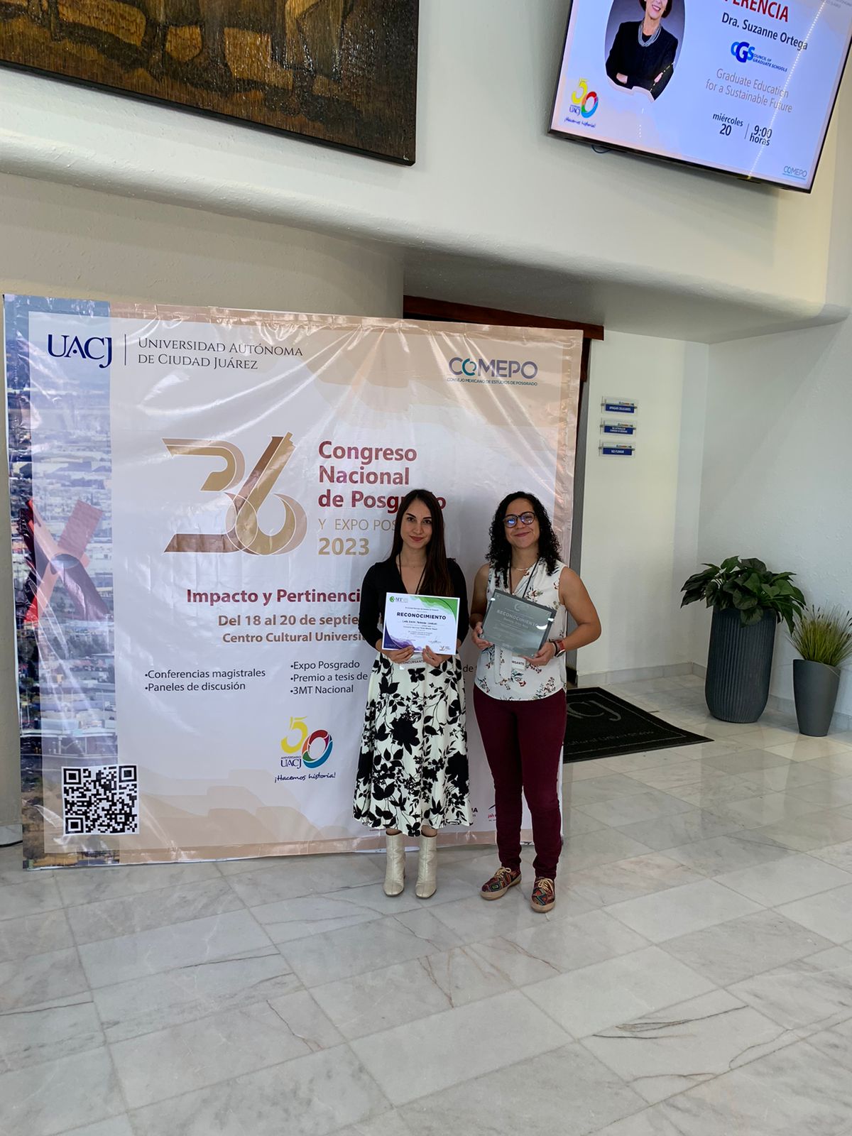 En el mismo congreso celebrado en la UACJ, la estudiante del doctorado en Agua y Energía del CUTonalá, Daniela Ortiz Ríos, recibió una Mención honorífica en la primera edición del “Premio COMEPO a tesis de posgrado para la innovación y el impacto social en México”, en la categoría de Doctorado con su tesis “Funcionalización de perlas porosas de poliestireno con nanopartículas orgánicas e inorgánicas para su aplicación en la remoción de contaminantes en agua”.