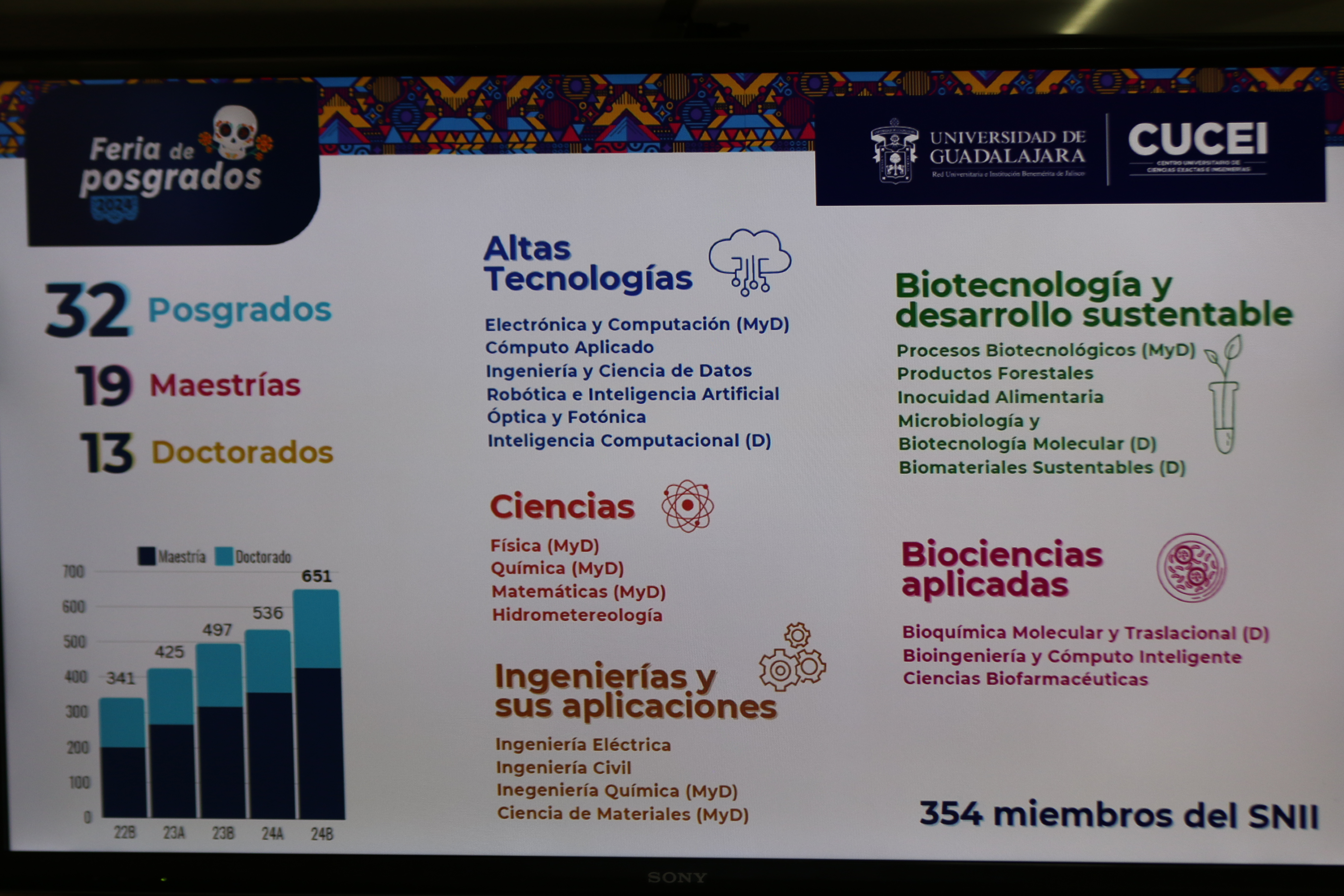 “Todos ellos en el padrón de posgrados del CONAHCYT. Hemos tenido un incremento sostenido en la matrícula de posgrados, y tenemos casi 700 estudiantes; de ellos, 220 son de doctorado y 420 de maestría; tenemos programas muy atractivos, todos atendidos por 354 investigadores del Sistema Nacional de Investigadoras e Investigadores (SNII), lo que hace un entorno propicio para estudiar un posgrado”, indicó.