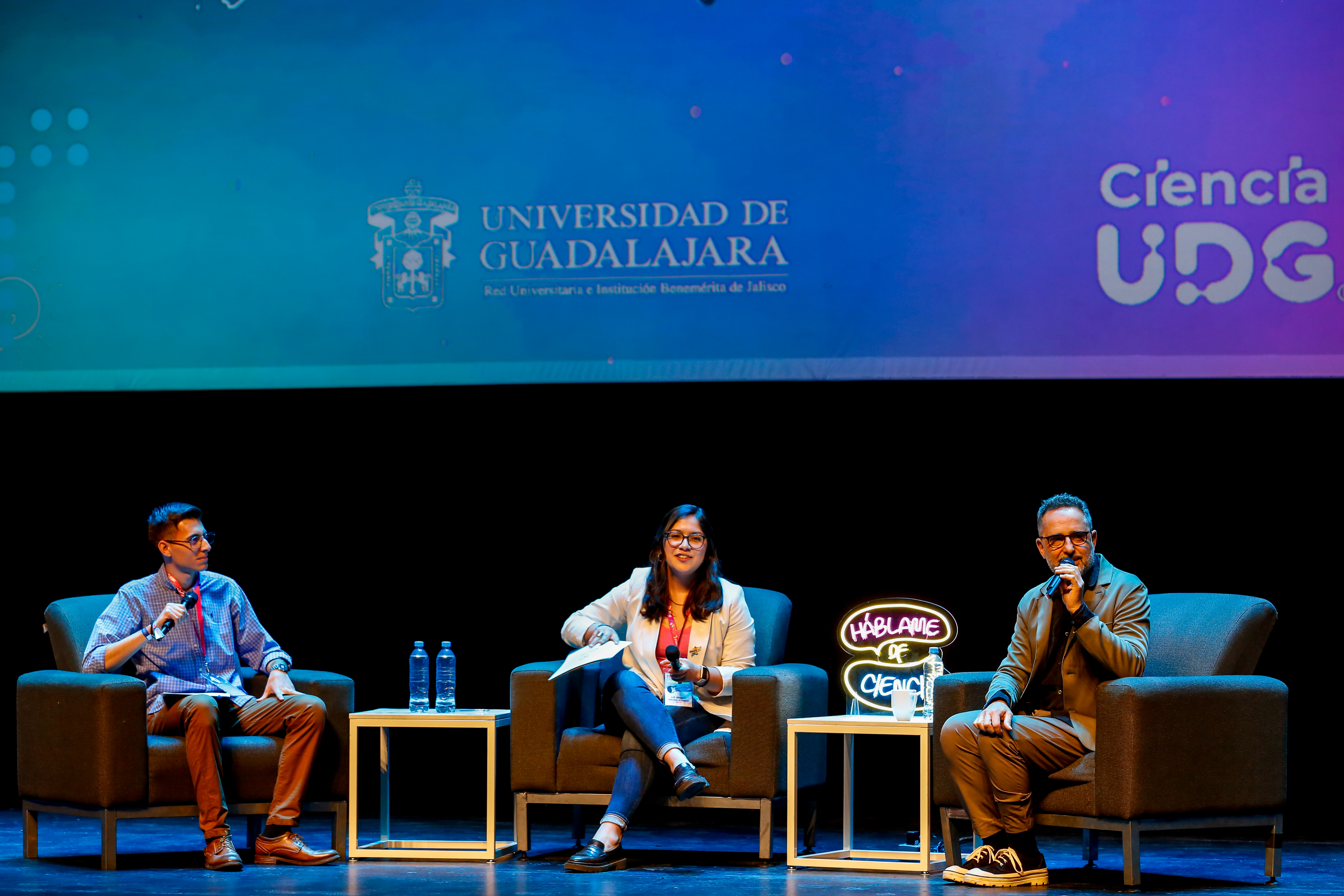 Este viernes, durante la última jornada de la Feria Internacional de la Música de Guadalajara (FIM GDL) 2024, se realizó el “Keynote: Jorge Drexler”, acompañado de los conductores del podcast Háblame de ciencia, Aldo y Liz. Esto, en la Sala 2 del Conjunto Santander de Artes Escénicas.