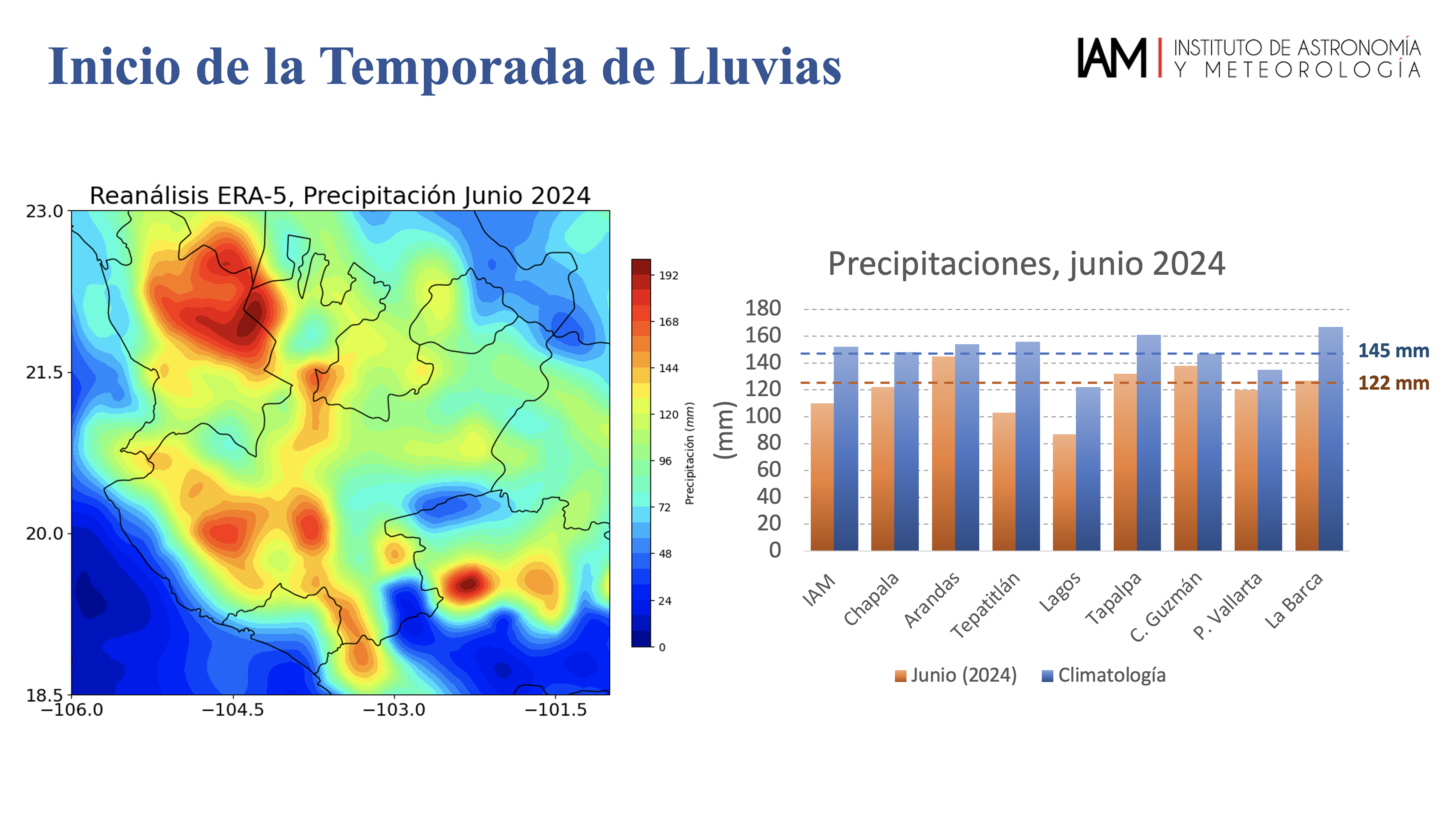 Así lo informó en rueda de prensa el profesor investigador del Instituto de Astronomía y Meteorología (IAM), del Centro Universitario de Ciencias Exactas e ingenierías (CUCEI) de la Universidad de Guadalajara (UdeG), maestro Mauricio López Reyes, quien explicó que el temporal de lluvias inició entre el 21 y 22 de junio.