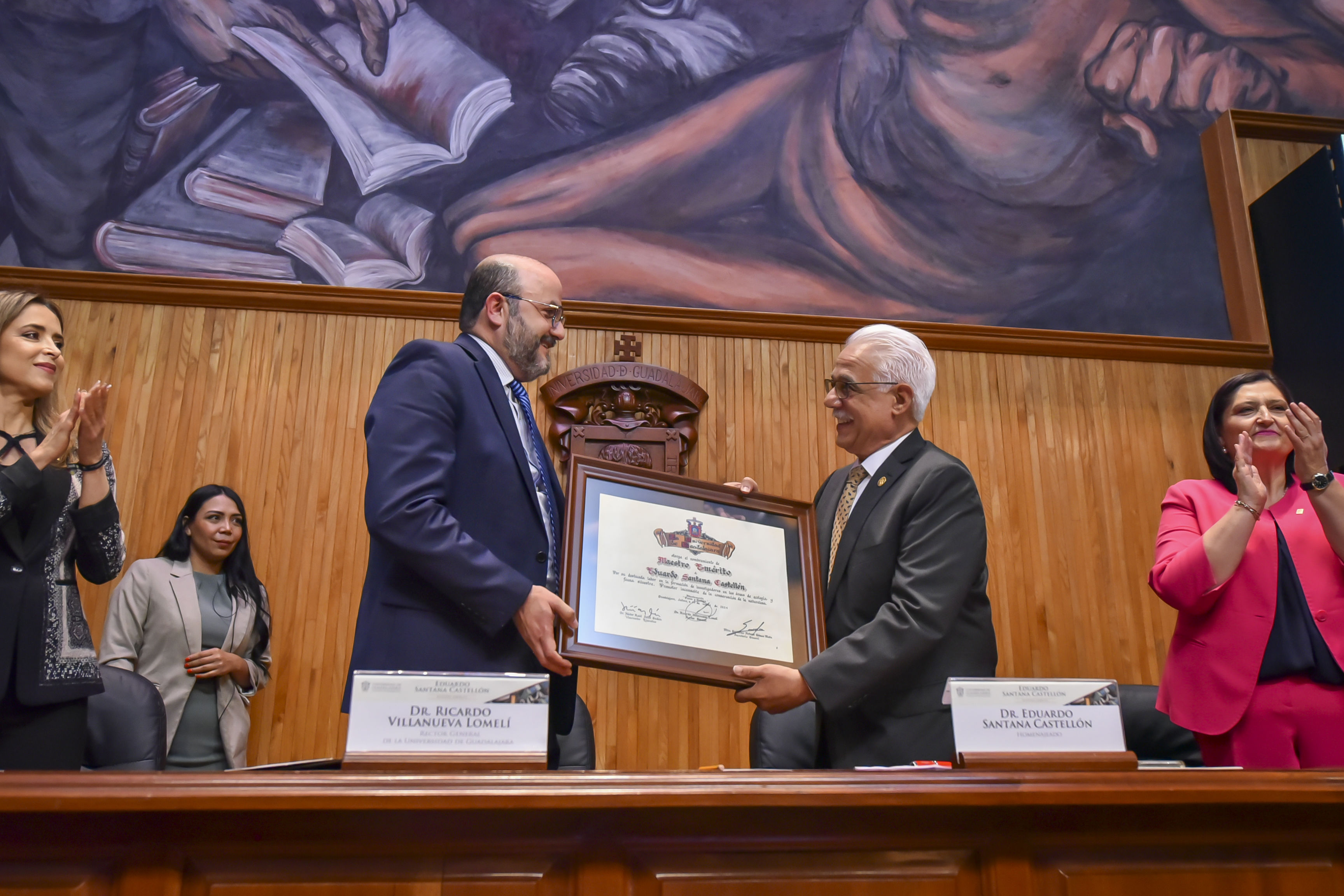 En una ceremonia que tuvo lugar en el Paraninfo Enrique Díaz de León, Santana Castellón, Director del Museo de Ciencias Ambientales (MCA), fue reconocido por contribuir a la conservación y estudio de ecosistemas, lo que derivó en iniciativas como la Reserva de la Biósfera de la Sierra de Manantlán.