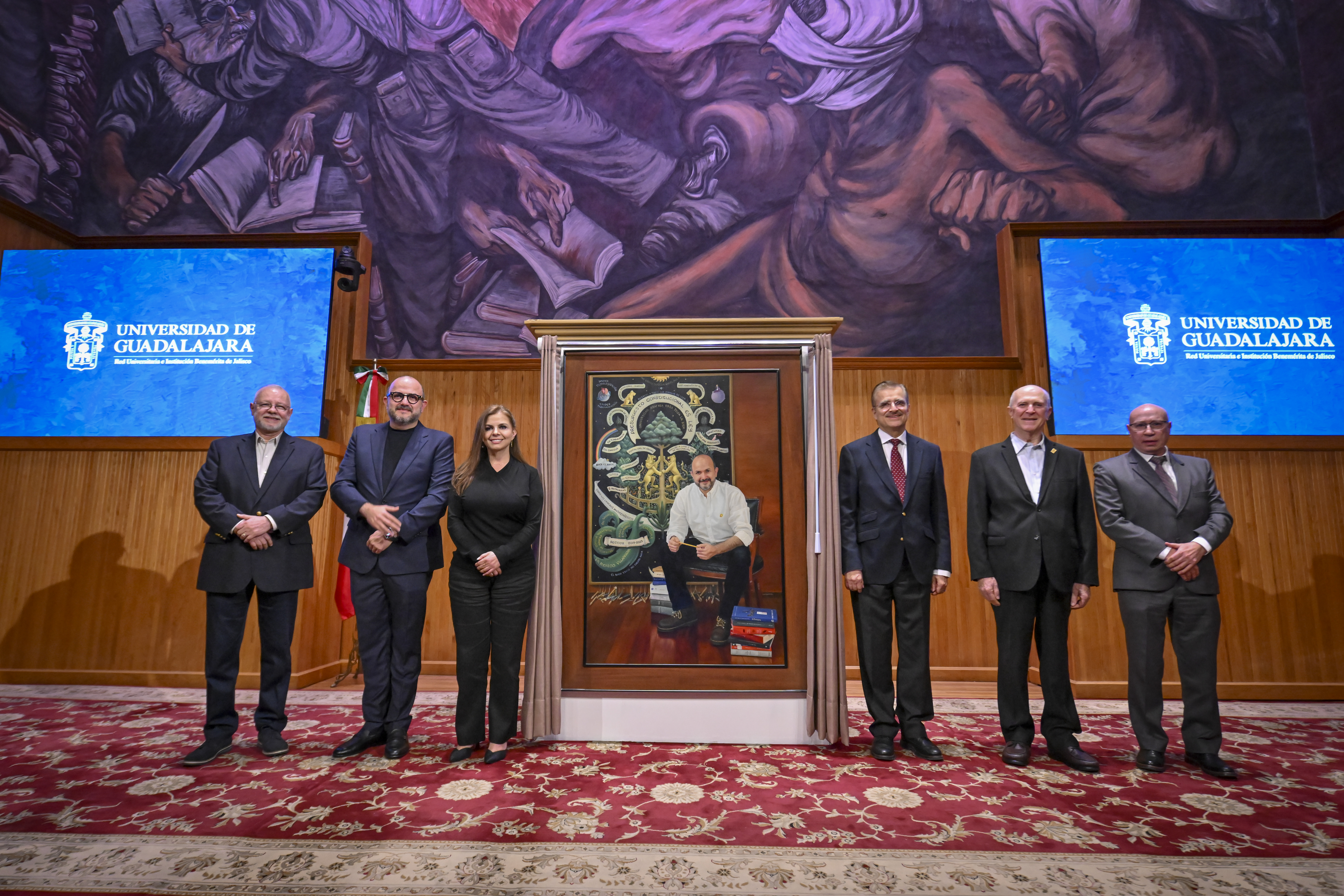 La Rectora General de la Universidad de Guadalajara, maestra Karla Planter Pérez develó el óleo del ex Rector General, doctor Ricardo Villanueva Lomelí, que quedará en pasillo de ex rectores del Paraninfo Enrique Díaz de León como un homenaje a los seis años de su administración, en el marco del centenario de refundación de esta Casa de Estudio.